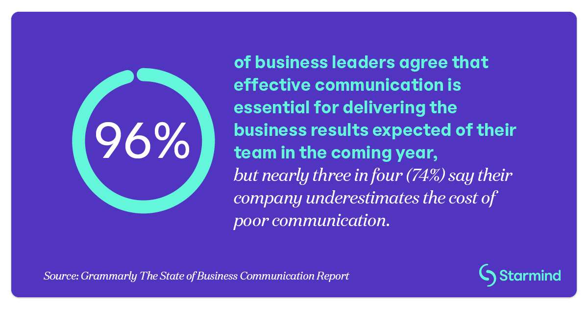Challenges related to effective communication aren’t new. However, recent changes in work environments, including the shift to hybrid and remote teams, have highlighted the importance of systems to connect teams with the support they need. A recent study from Grammarly and The Harris Poll found that while almost 100% of business leaders understand how effective communication drives desired business outcomes, 74% also said their company fails to appreciate the negatives of poor communication.